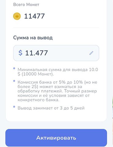 Монеты можно обменять на реальные деньги и вывести к себе на карту. Вывод от 10$ (эквивалент 10 000 монет)
